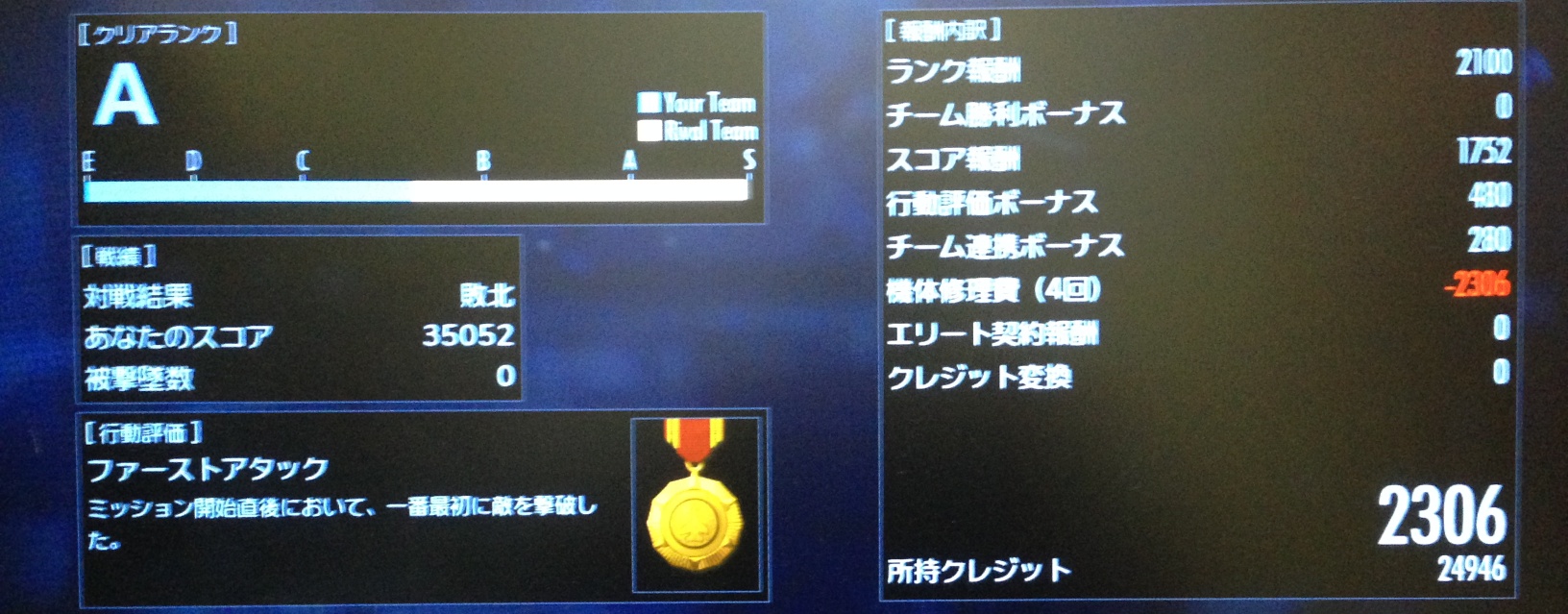 Sランククリアに、チーム勝利もついて9216クレジットゲットだ。
