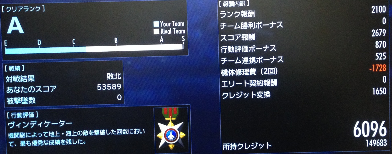 Sランククリアにチーム勝利が付いて10392クレジット稼いだ。
