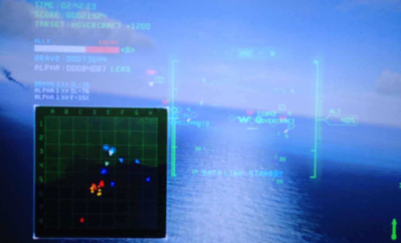 ダッシュの効かないF/A-18FのR1スロットルを凹むくらい押し込んで、海岸のBUNKER(1400)にLASMを合わせまっしぐら。ロックオンで2発でスコアゲット。そのまま対岸の艦船を狙ってLASM撃つが空振り、誰かに取られた。右旋回しながら適当にミサイル発射し市街に向かう。