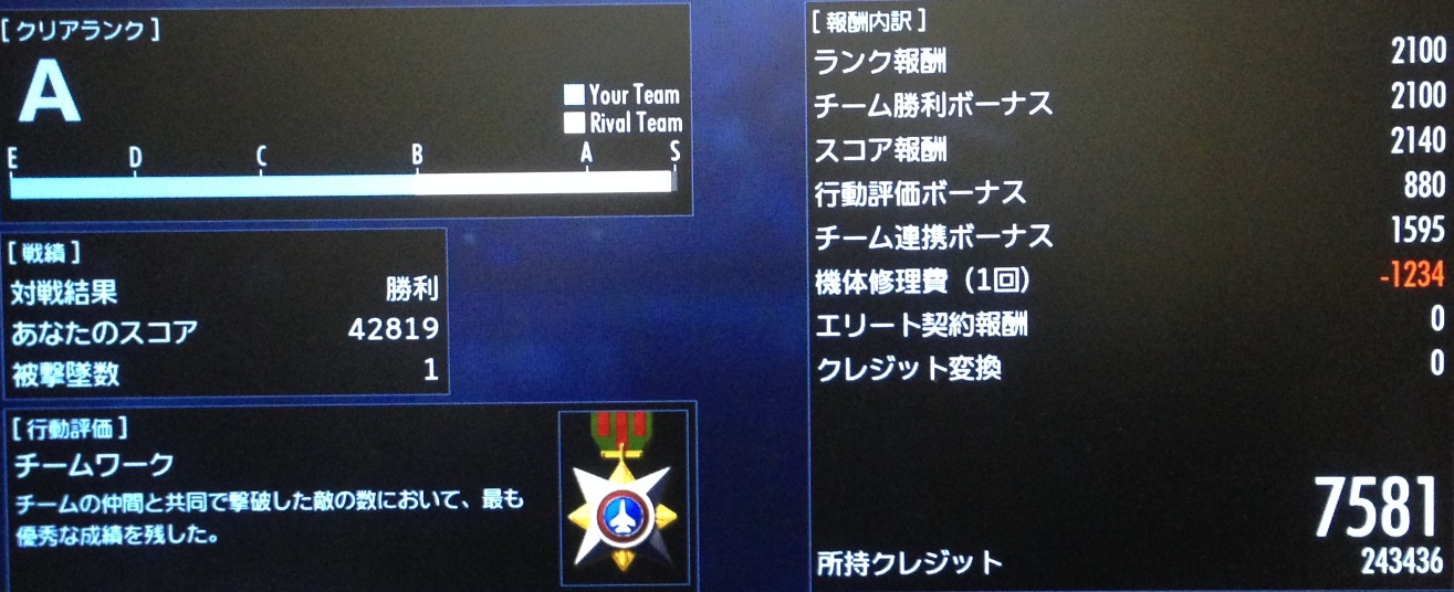 42819点稼いだがAクリアだった。やはり1回目の出撃で1600ちょいのレートの部屋でSクリアとったのは珍しいパタンだったのか。