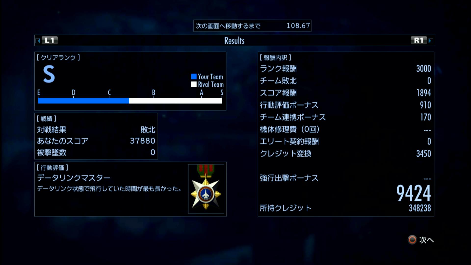 オレは37579点だったが僚機ががんがってくれてチーム勝ち。12418クレジット。