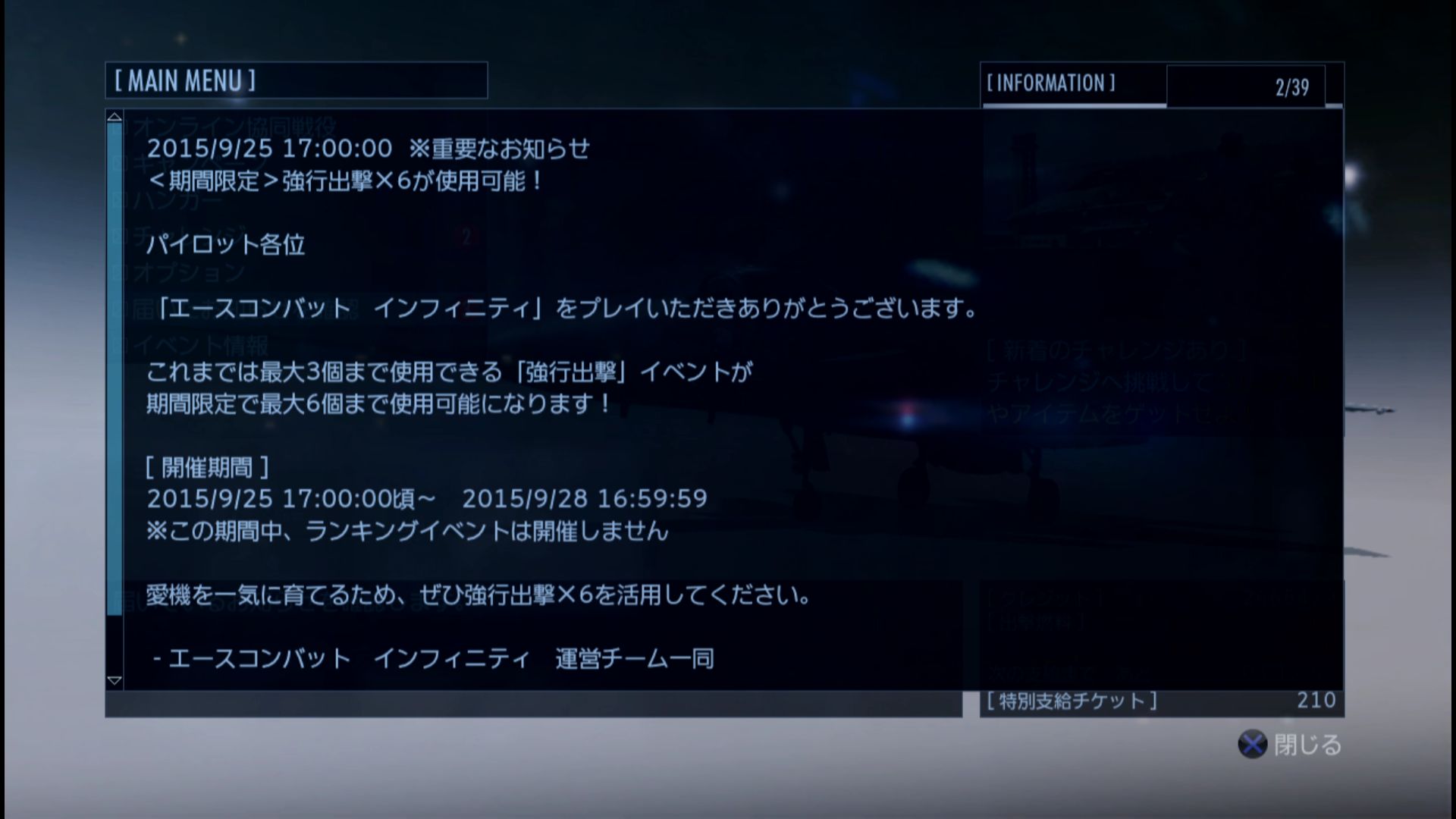 ■エースコンバットインフィニティからのお知らせ