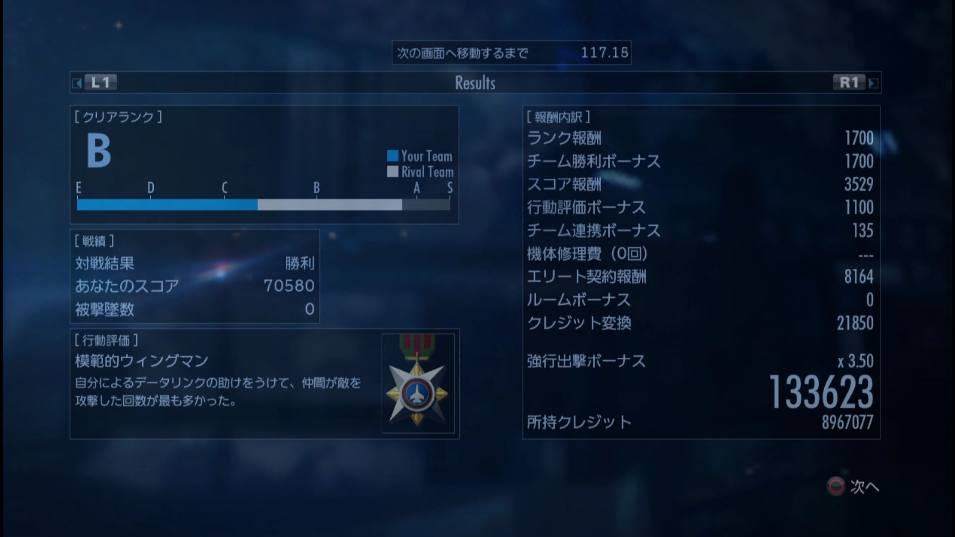 しかし、通常ミッションのSクリア勝利ボーナスが3000クレジット。これがエリートで2倍の強行で3.5倍で7倍付いたら21000クレジットなので、大きいぜ。