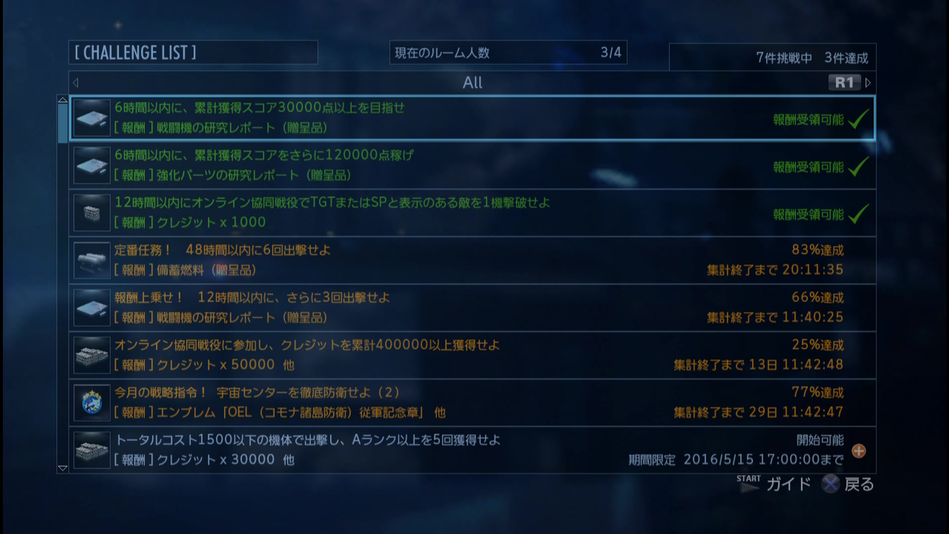 さあて5月になって新しいランキングとかチャレンジとかがでてきたぞ。おっと今月の戦略指令コモナ徹底防衛(2)で通り名『Blue Skies』だ。こいつを6出撃で取ってやろう。