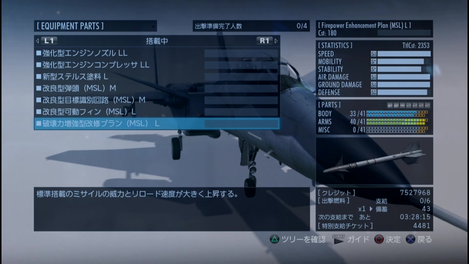 ARMSのパーツ詳細:スペース区切り毎に機関砲、通常ミサイル、SP.W、Xは強化なし。[ GUN MSL SP.W ]