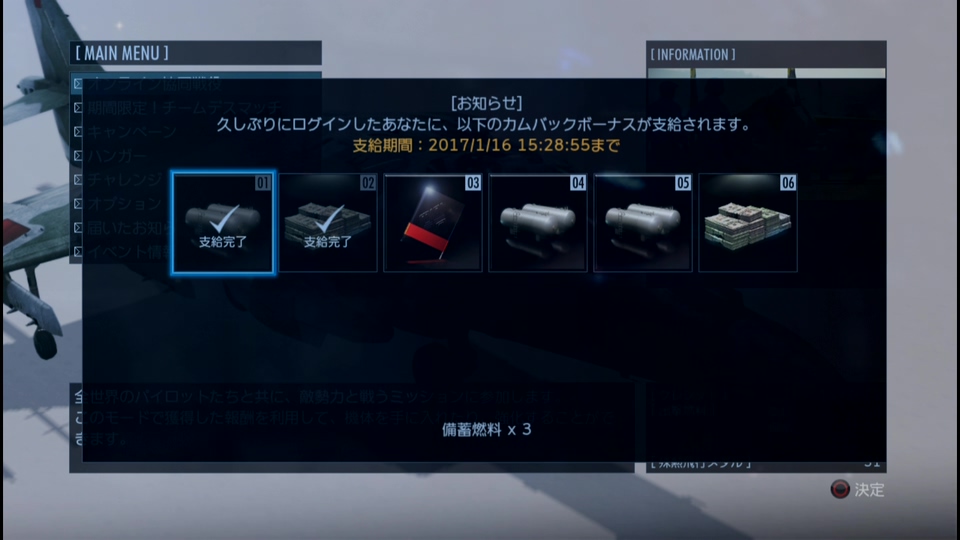 エースコンバットインフィニティにしばらくログインしていないと、カムバックボーナスが発生する。