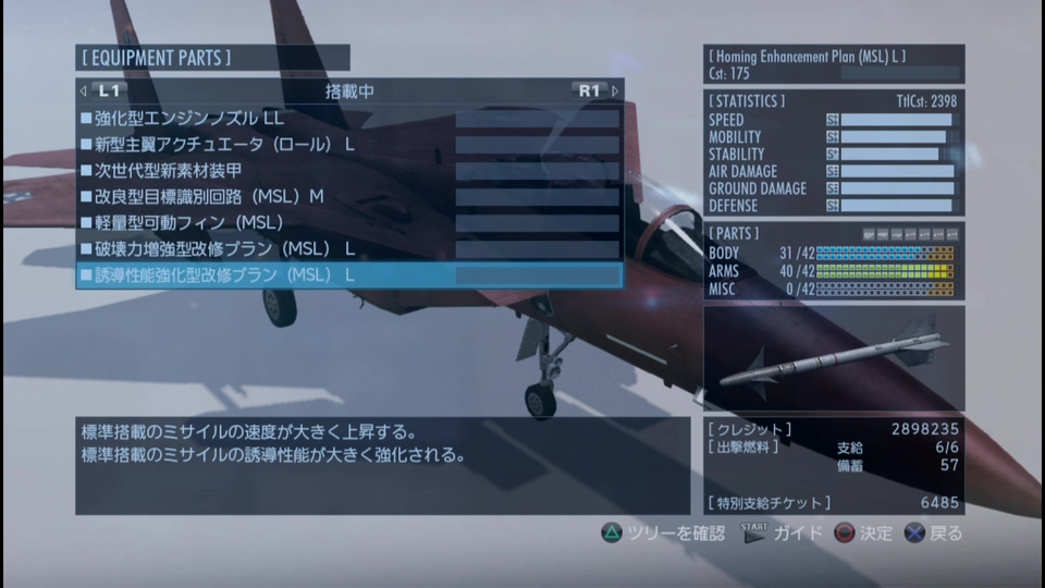 ARMSのパーツ詳細:スペース区切り毎に機関砲、通常ミサイル、SP.W、Xは強化なし。[ GUN MSL SP.W ]