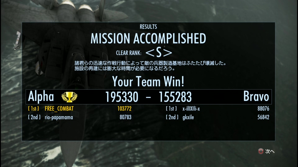 今日は、シャムロックLv.11で武器庫を飛ぶ。したらラスト3戦目でrioさん参戦で、さらに同チーム出撃でシャムロック編隊だぜー