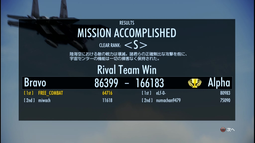 1. 連戦、ありがとうございました。#5は同時に真ん中へ突撃するとSが微妙か、というところだったので居残りやってました。やはりマルチ相手だと、対空も独占されるので、真ん中のスコアを多少取っておくことも勝ちに不可欠というところですね…