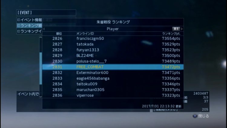 朱雀戦役ランキング2831でフィニッシュしてたぜ
