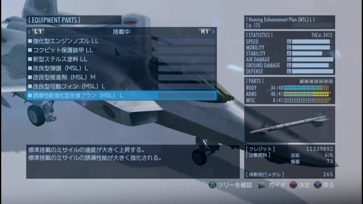 ARMSのパーツ詳細:スペース区切り毎に機関砲、通常ミサイル、SP.W、Xは強化なし。[ GUN MSL SP.W ]