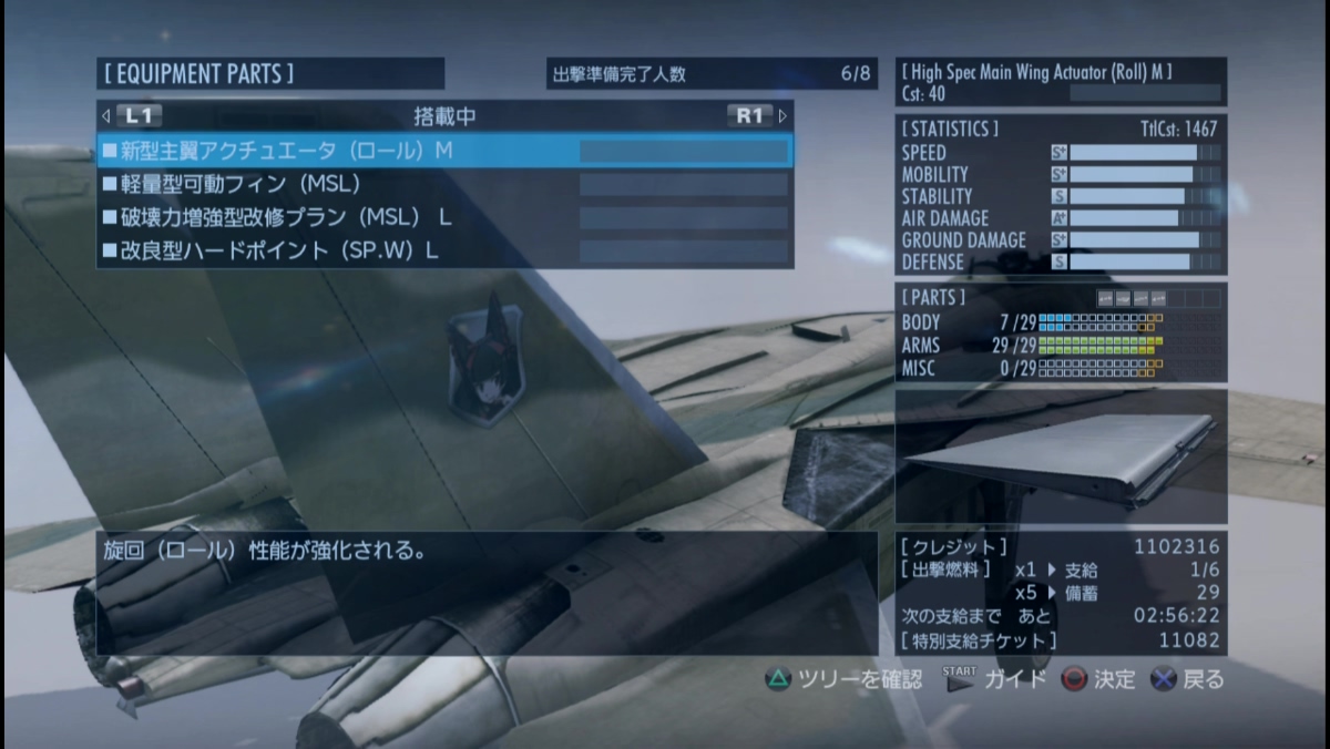 ARMSのパーツ詳細:スペース区切り毎に機関砲、通常ミサイル、SP.W、Xは強化なし。[ GUN MSL SP.W ]